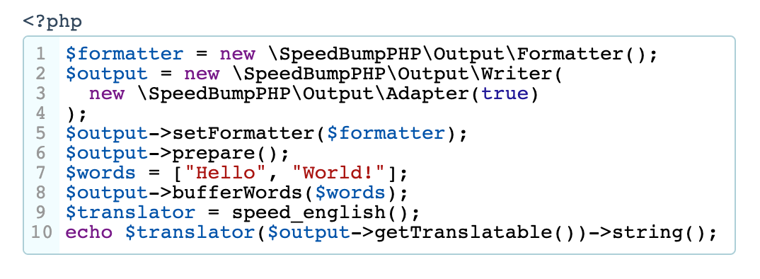 SpeedBumpPHP's strength comes from its versatility and verbosity. Hello World has never looked like this before!